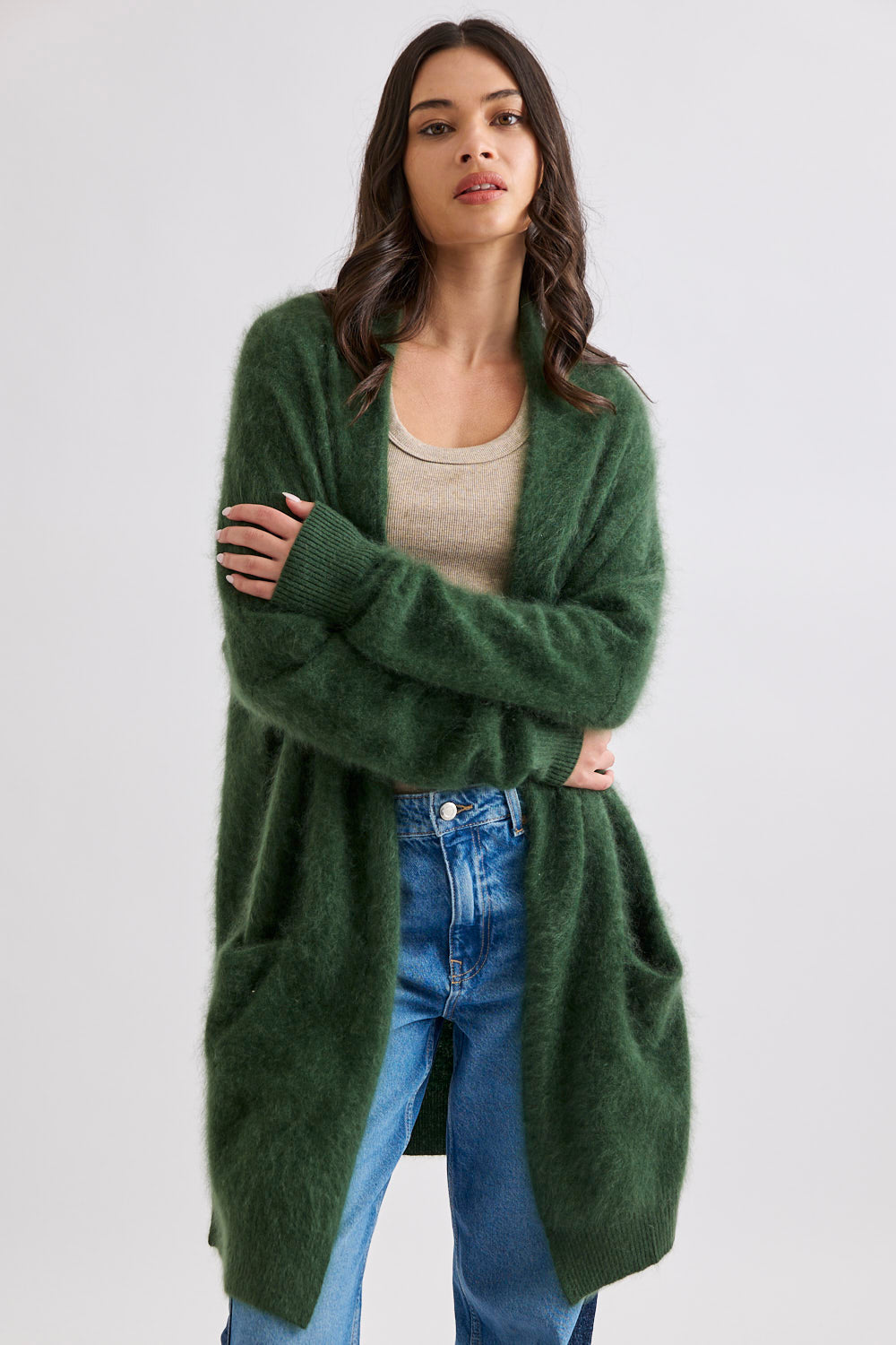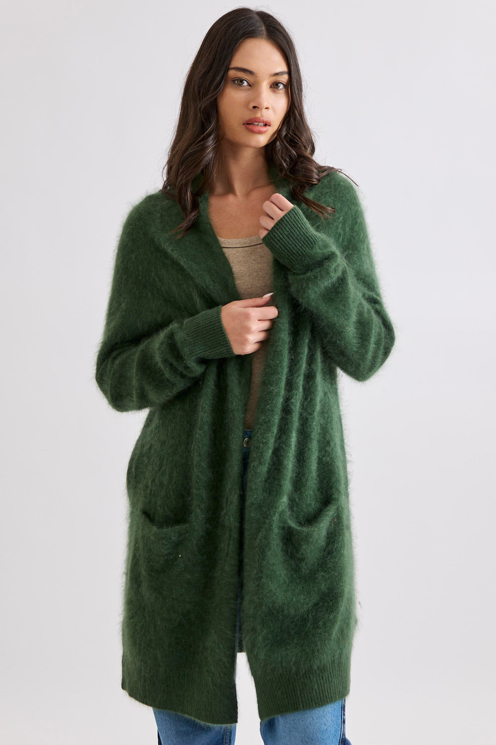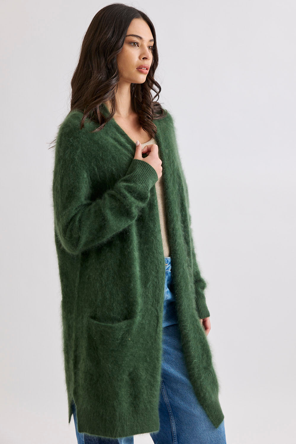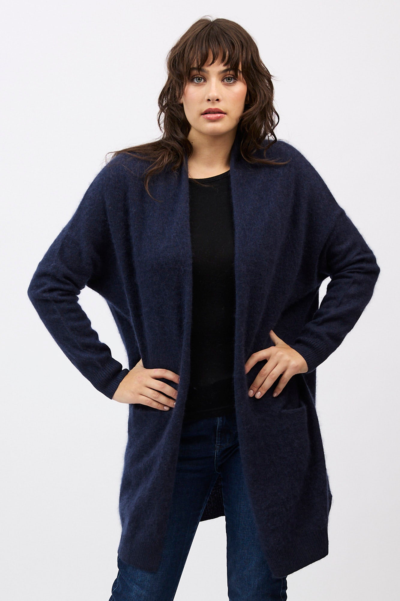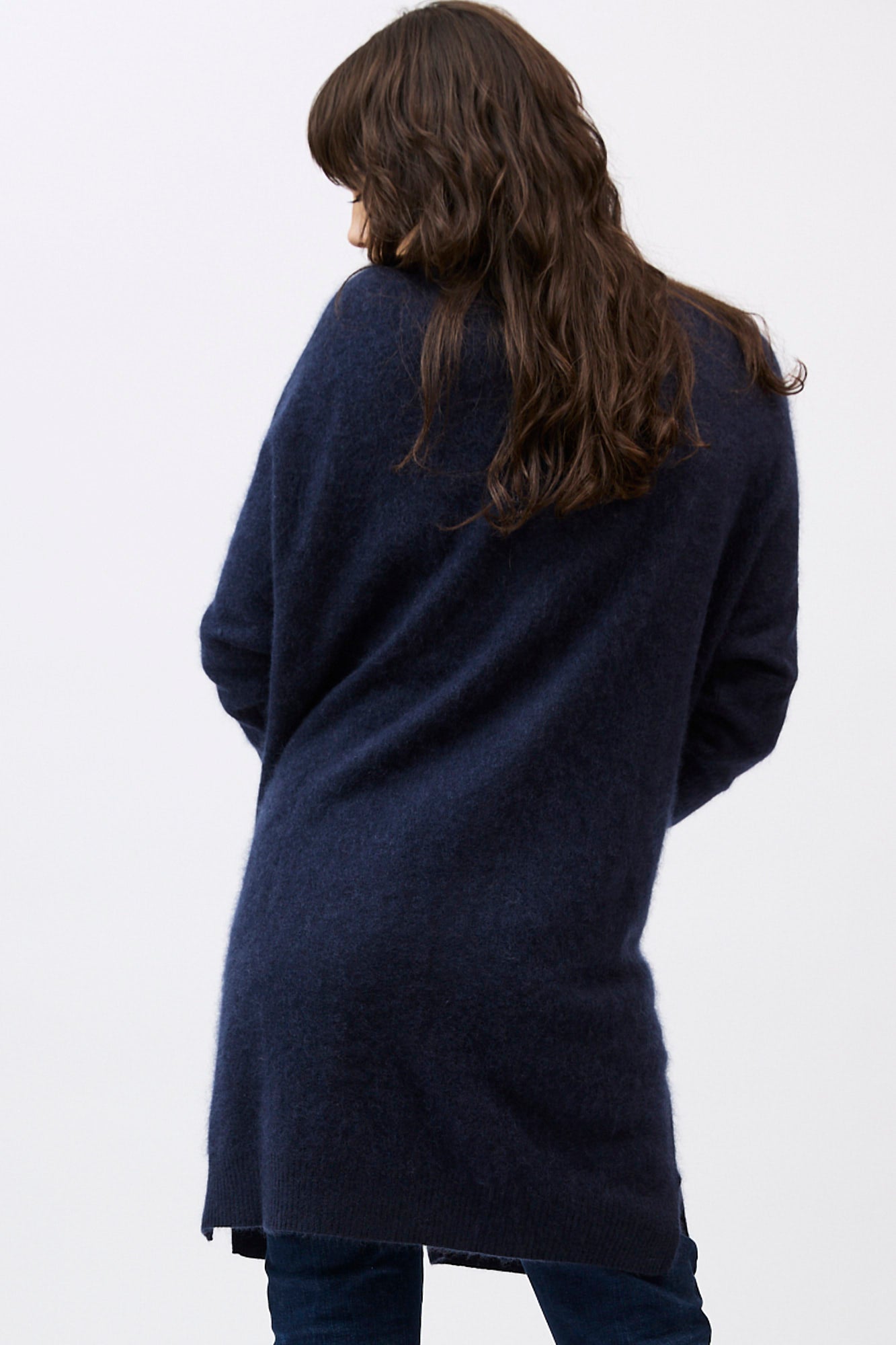Designed with a longline, open-front silhouette, the Petra Cardi serves as the ultimate sensory layer. The generous proportions provide an elegant drape, showcasing the rich, cloud-like loft of our bespoke brushed finish.