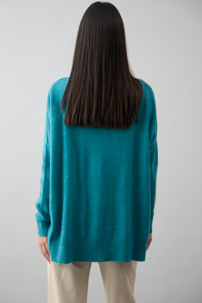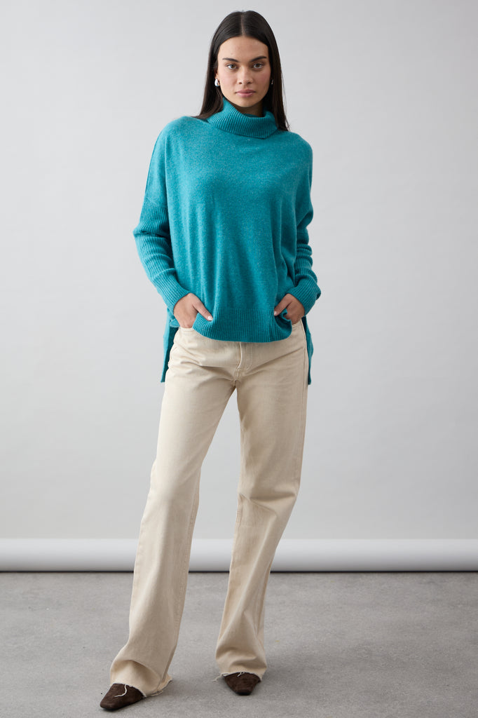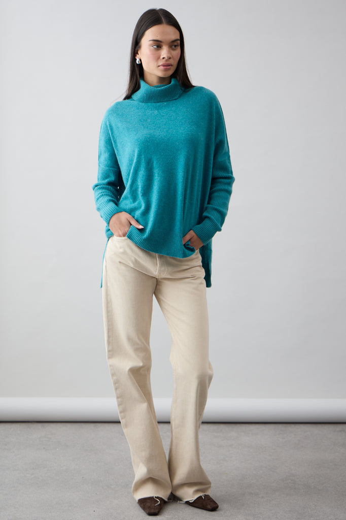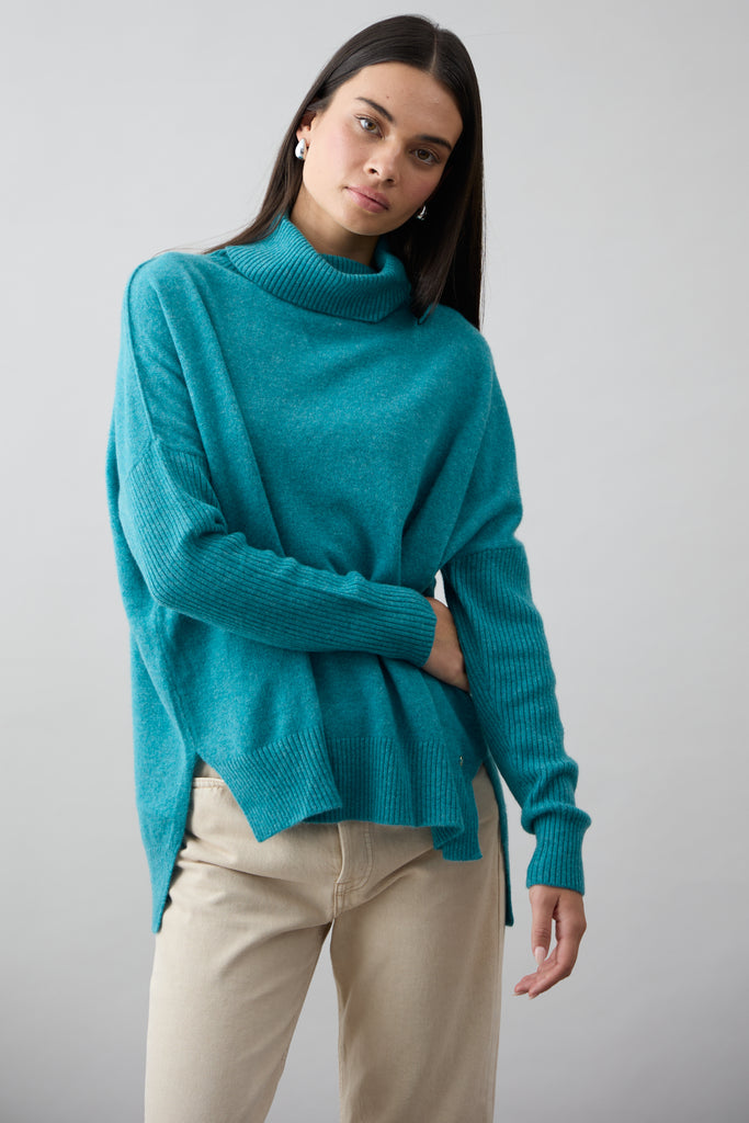 This timeless roll-neck knit is made from 100% Mongolian Cashmere. Featuring a flattering rib detail across the hemline and sleeves. The stepped back and side splits creates a relaxed drape to maximise comfort. This classic style looks great over jeans and is a winter wardrobe staple.