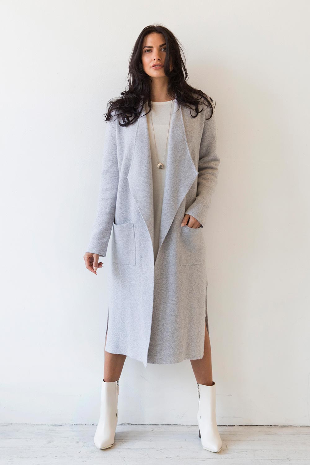The longline Catya Coat can be layered on top of your favourite cashmere sweater and includes removable shoulder pads.