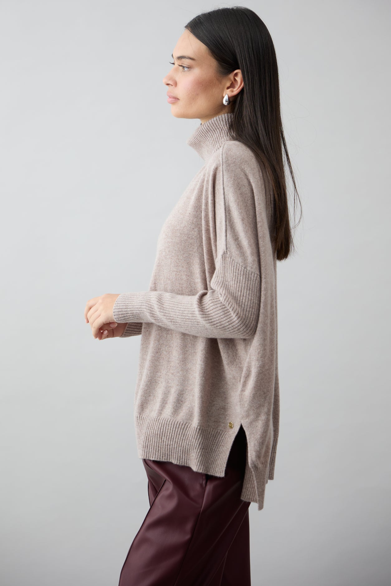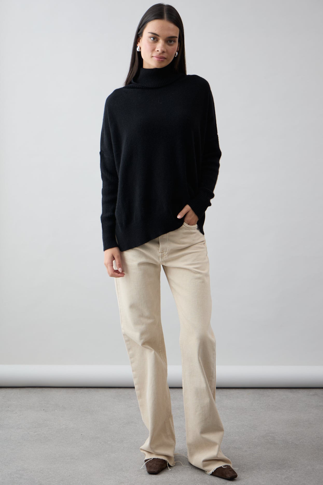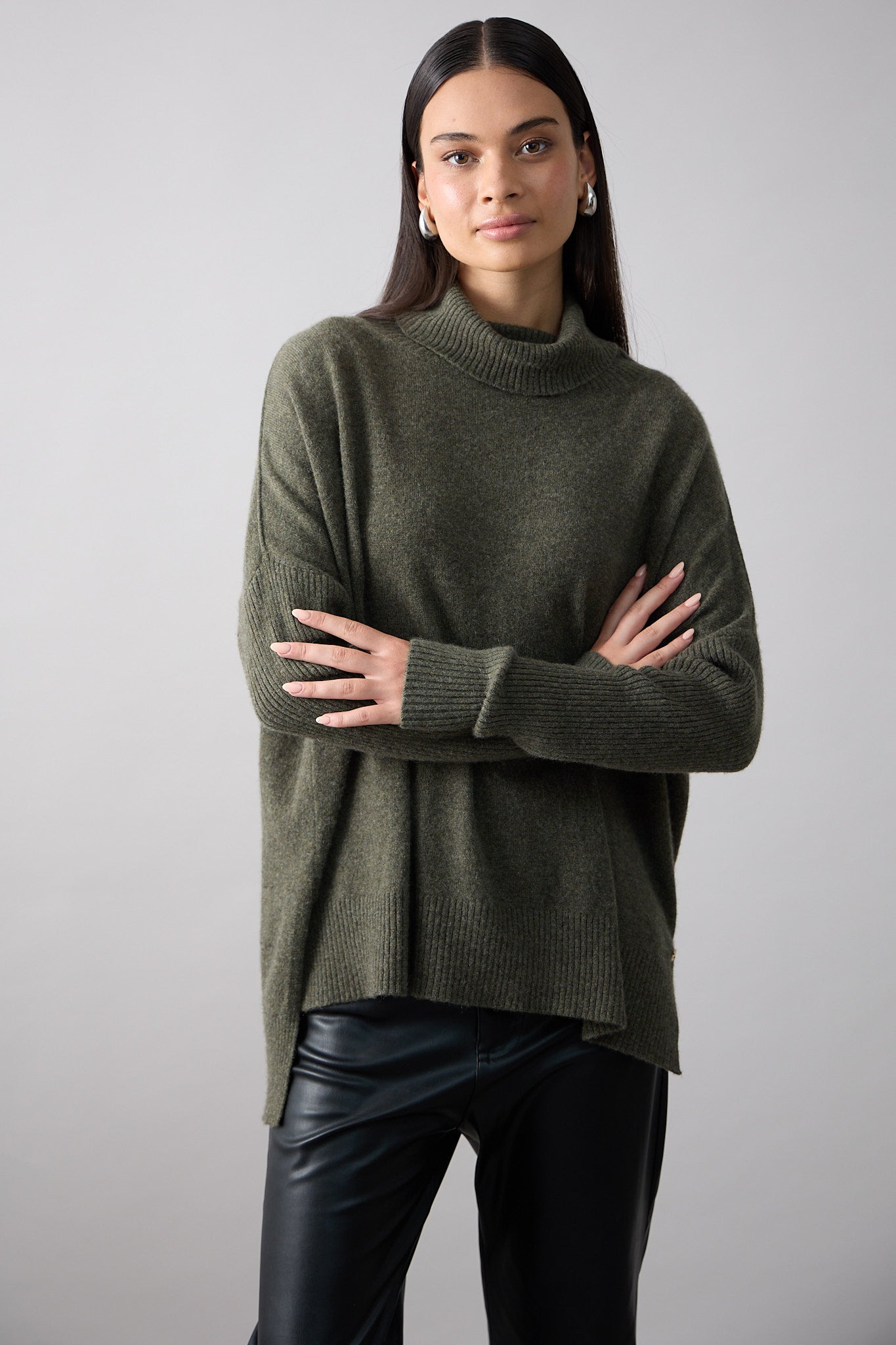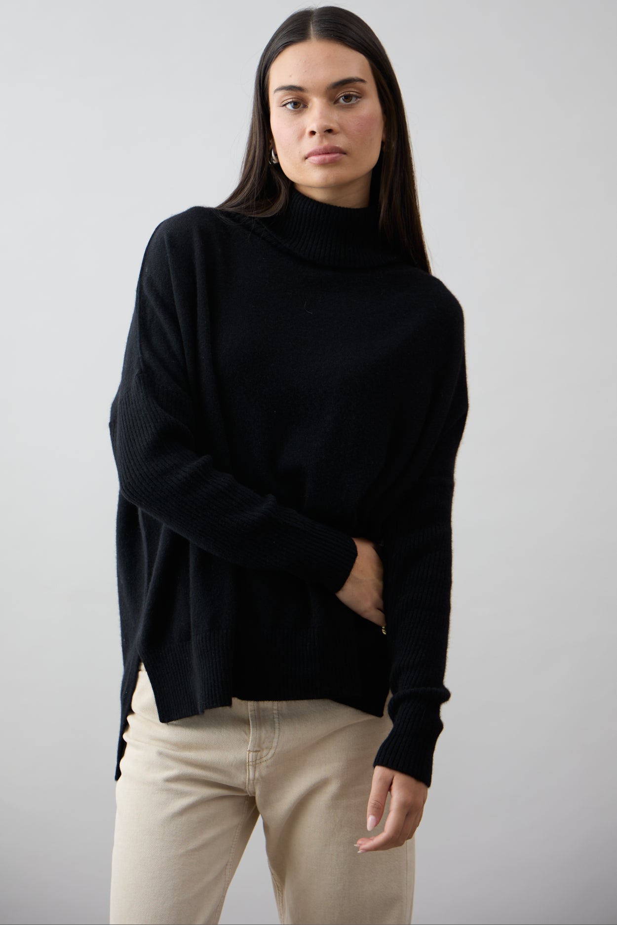 This timeless roll-neck knit is made from 100% Mongolian Cashmere. Featuring a flattering rib detail across the hemline and sleeves. The stepped back and side splits creates a relaxed drape to maximise comfort. This classic style looks great over jeans and is a winter wardrobe staple.