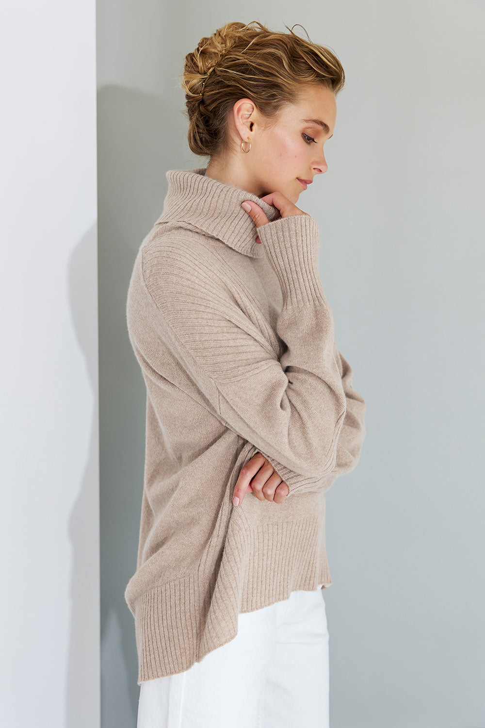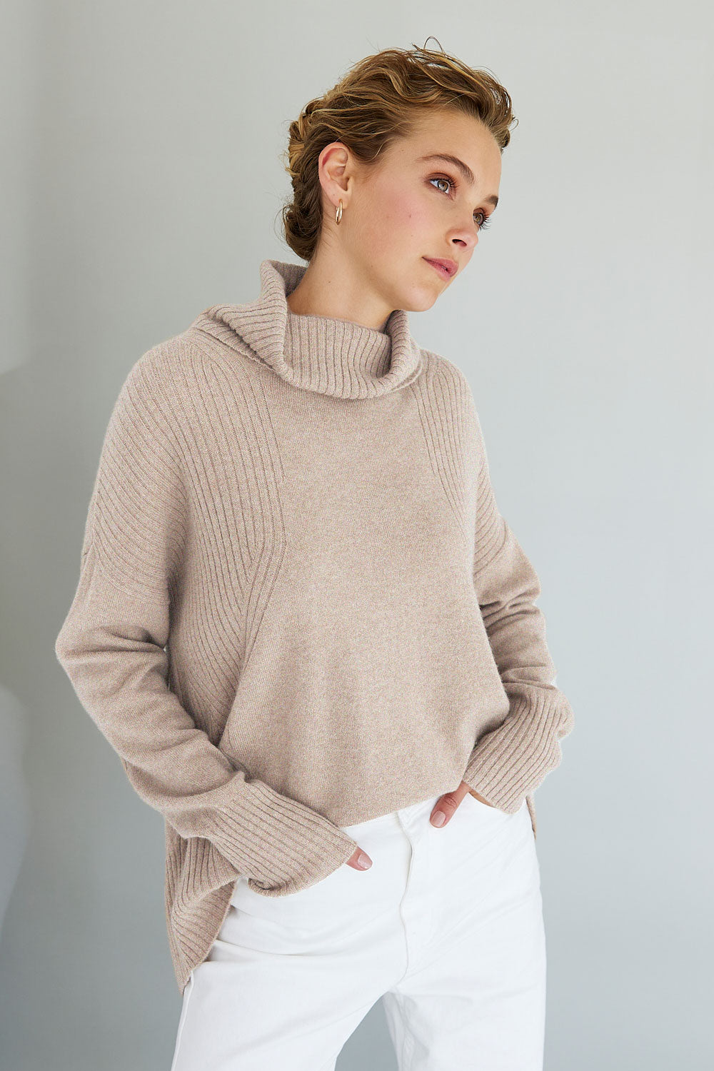 This timeless roll-neck sweater is a Winter weekend staple. Featuring a flattering rib detail across the drop shoulder design. Cut from our relaxed wide block, with a soft ribbed roll neck and curved hemline scooping at the back. This classic style looks great over jeans.