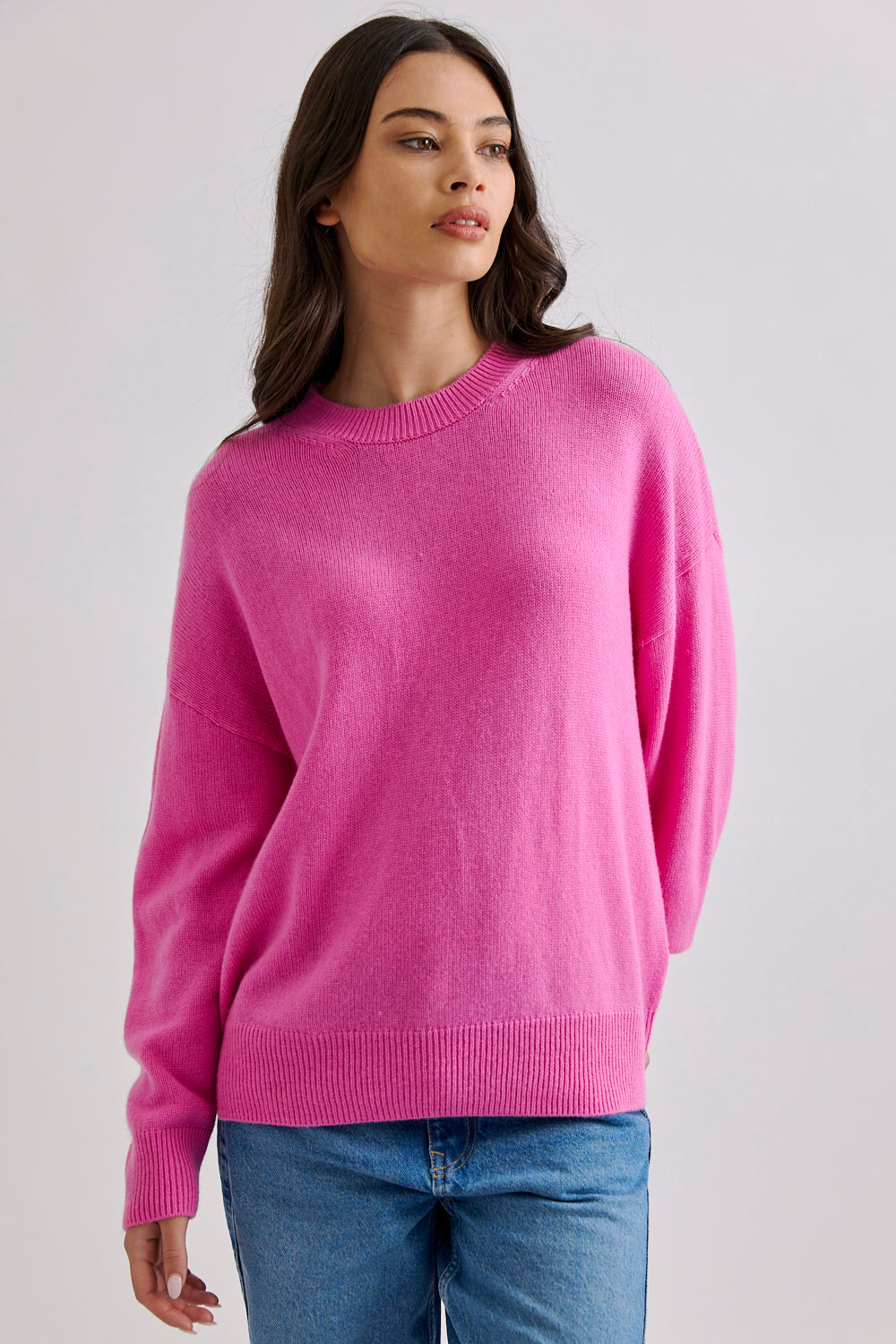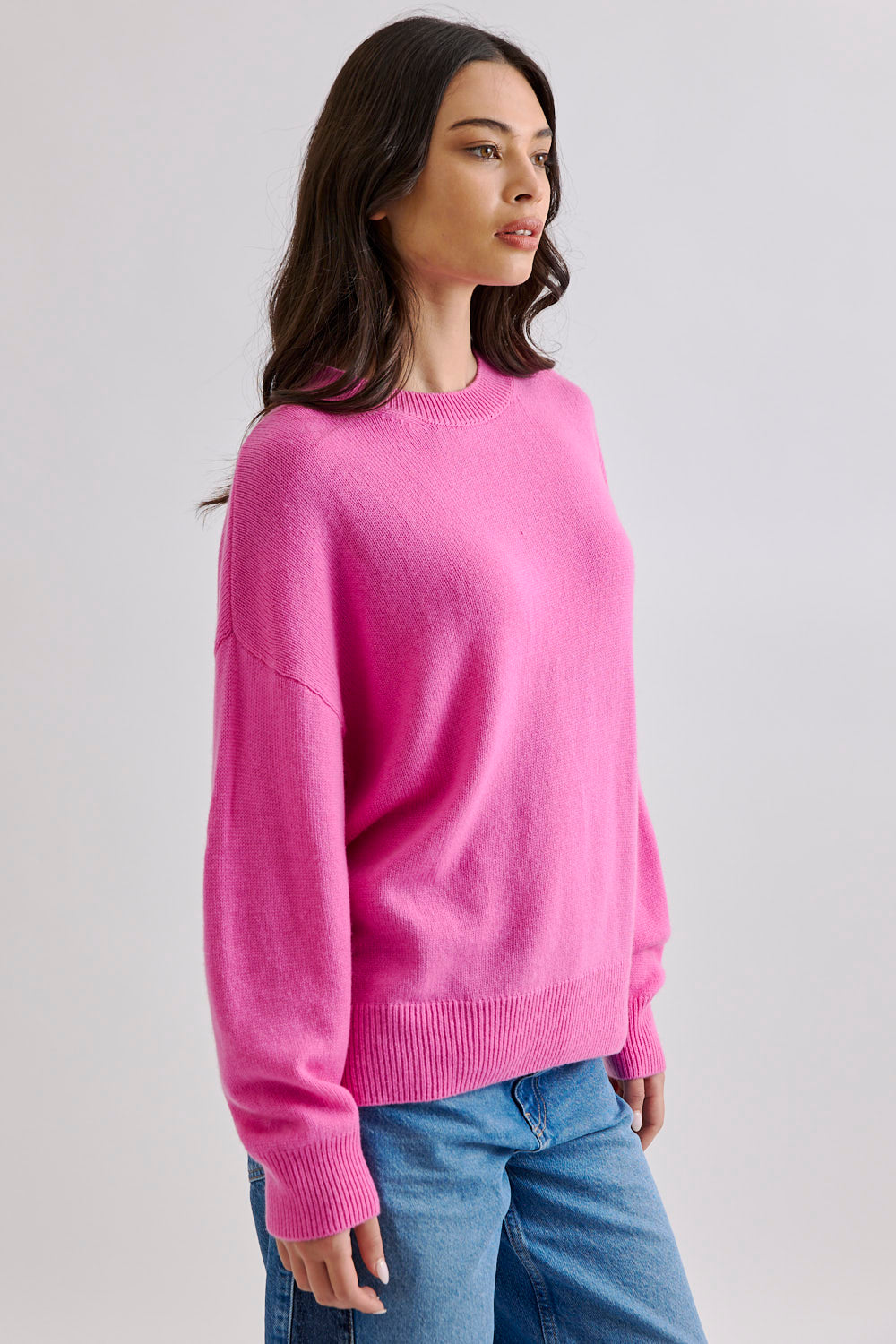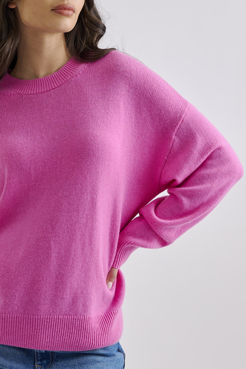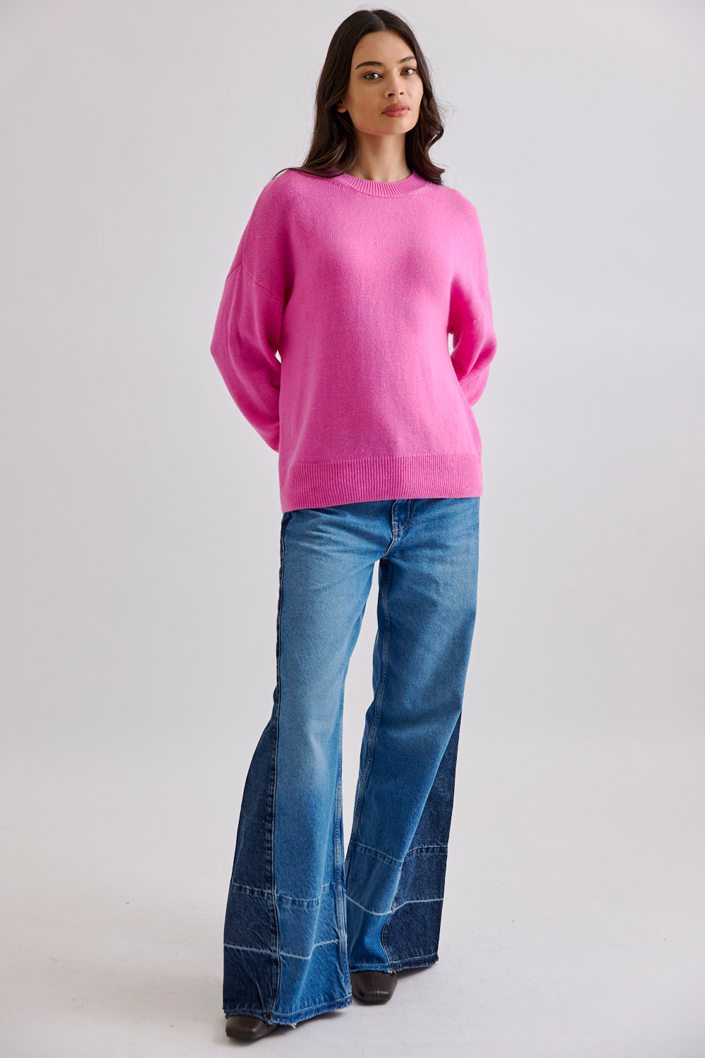 Silhouette: Relaxed crew neck profile with dropped shoulders and refined ribbed trims.