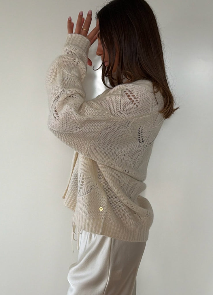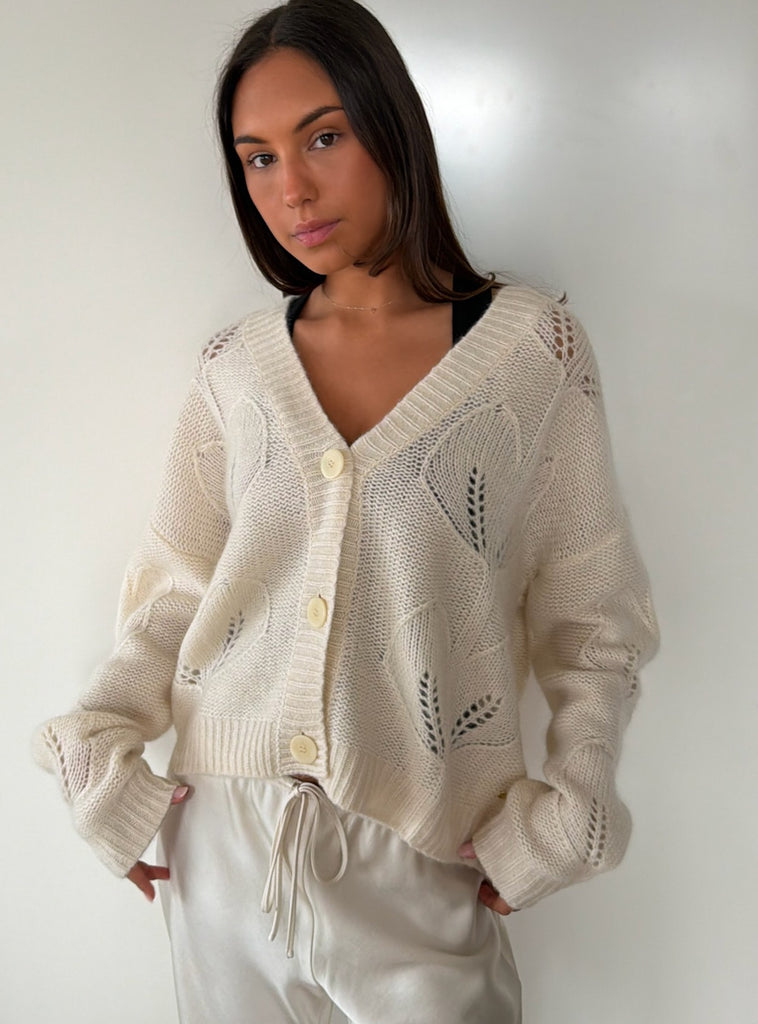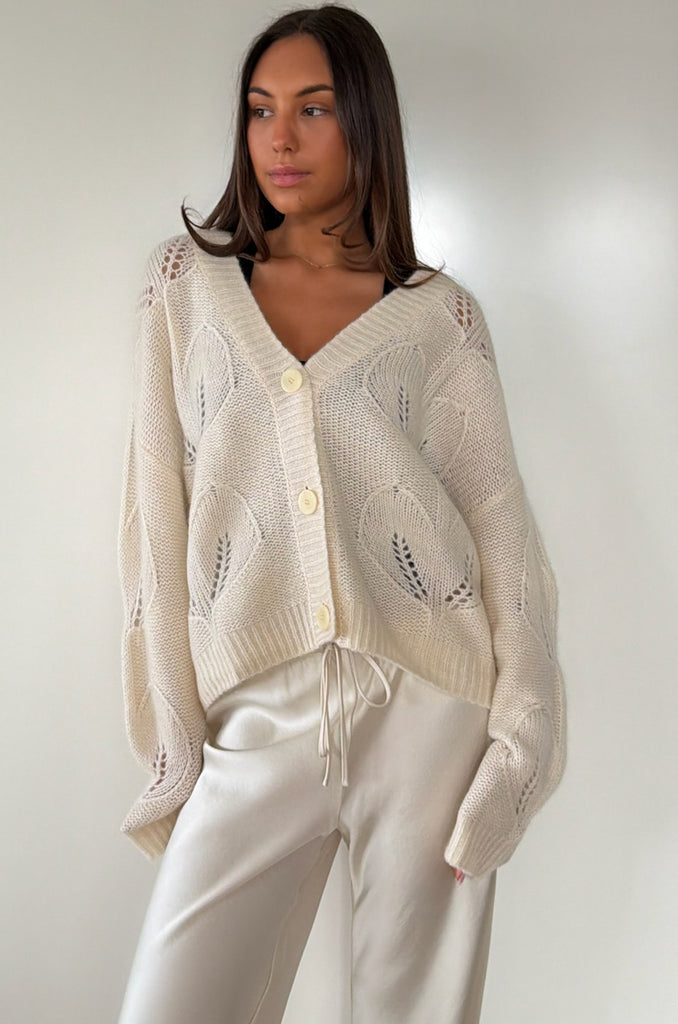 The Milla Cardi brings a refined touch to everyday dressing. Showcasing delicate leaf-inspired detailing across the knit, this piece offers a soft, feminine texture with a modern twist. Its open-front design and relaxed fit make it an effortless layer, whether worn over a simple tee or a crisp shirt.