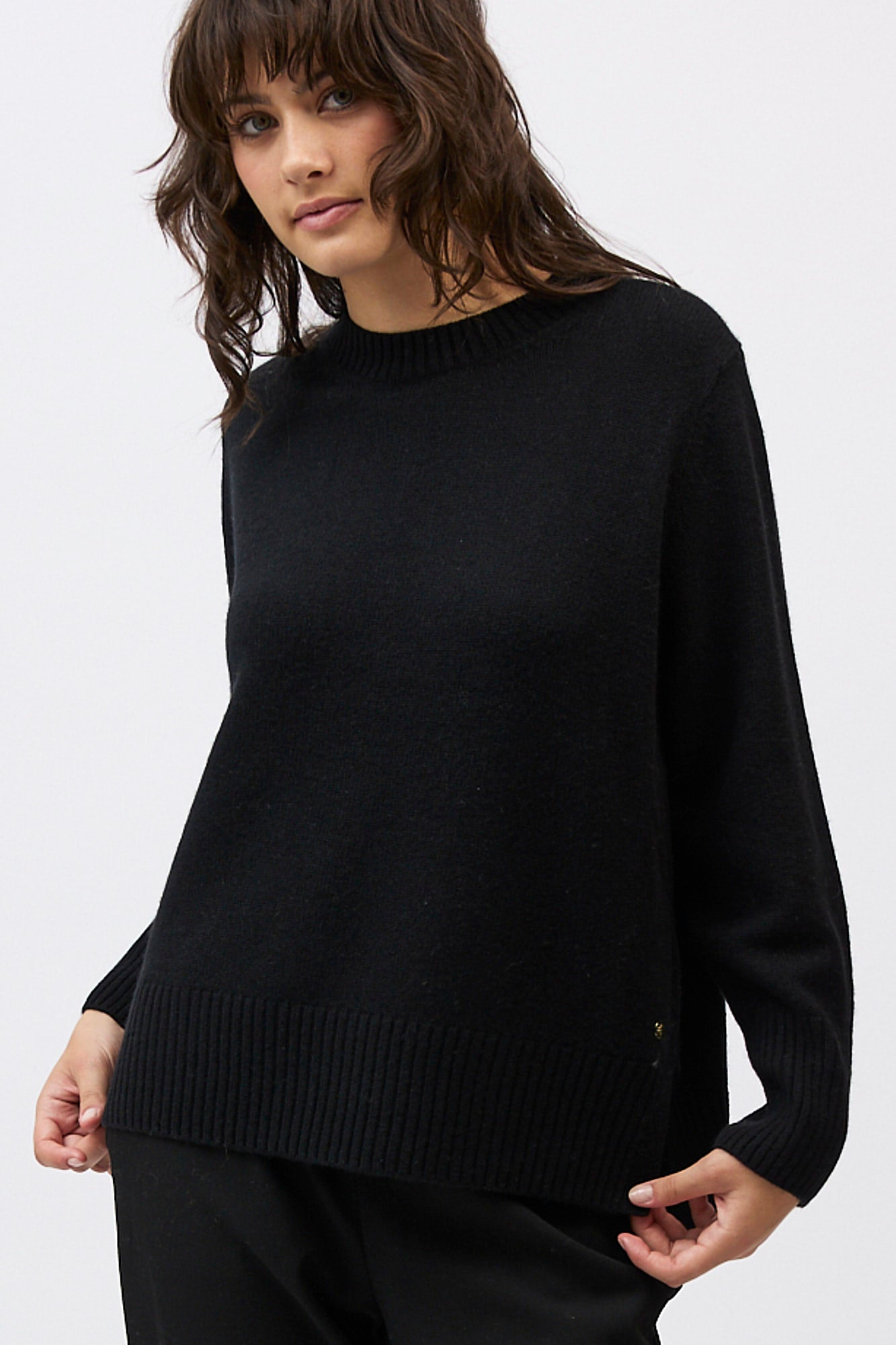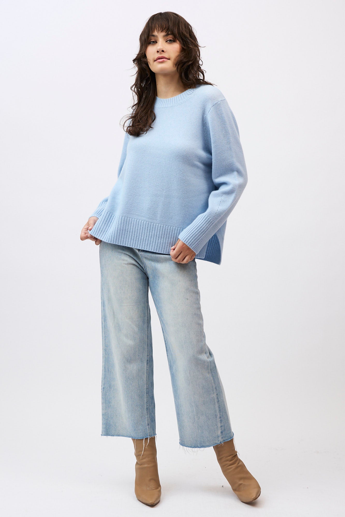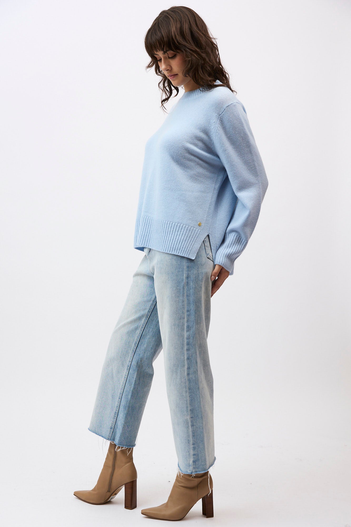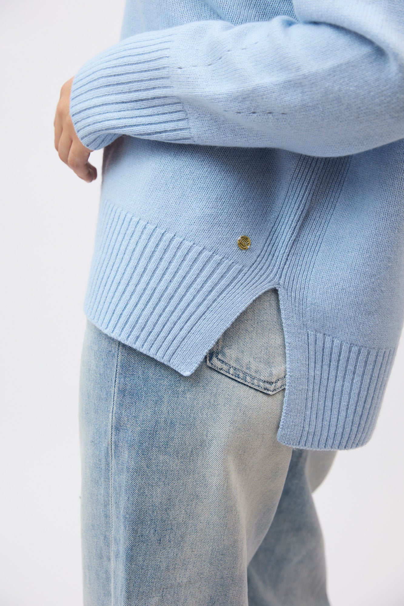 Silhouette: A classic crew neck profile featuring a contemporary high-low hem with deep side splits and exaggerated ribbed cuffs.