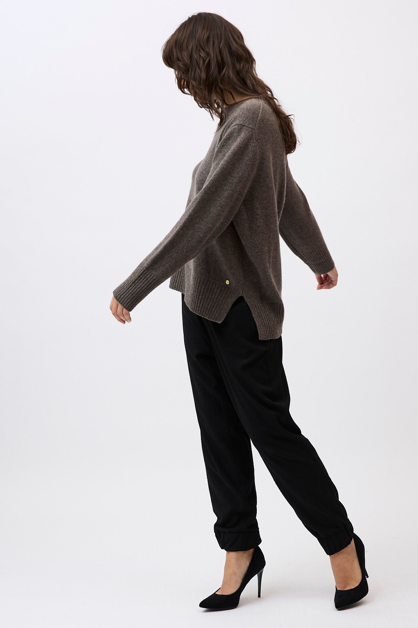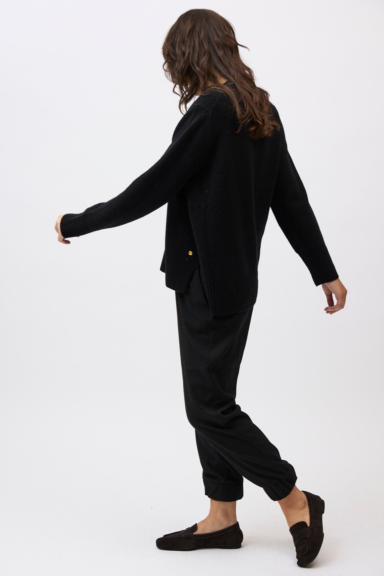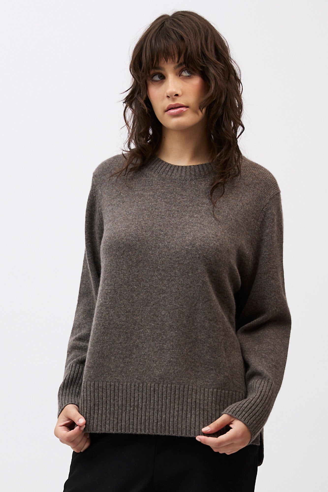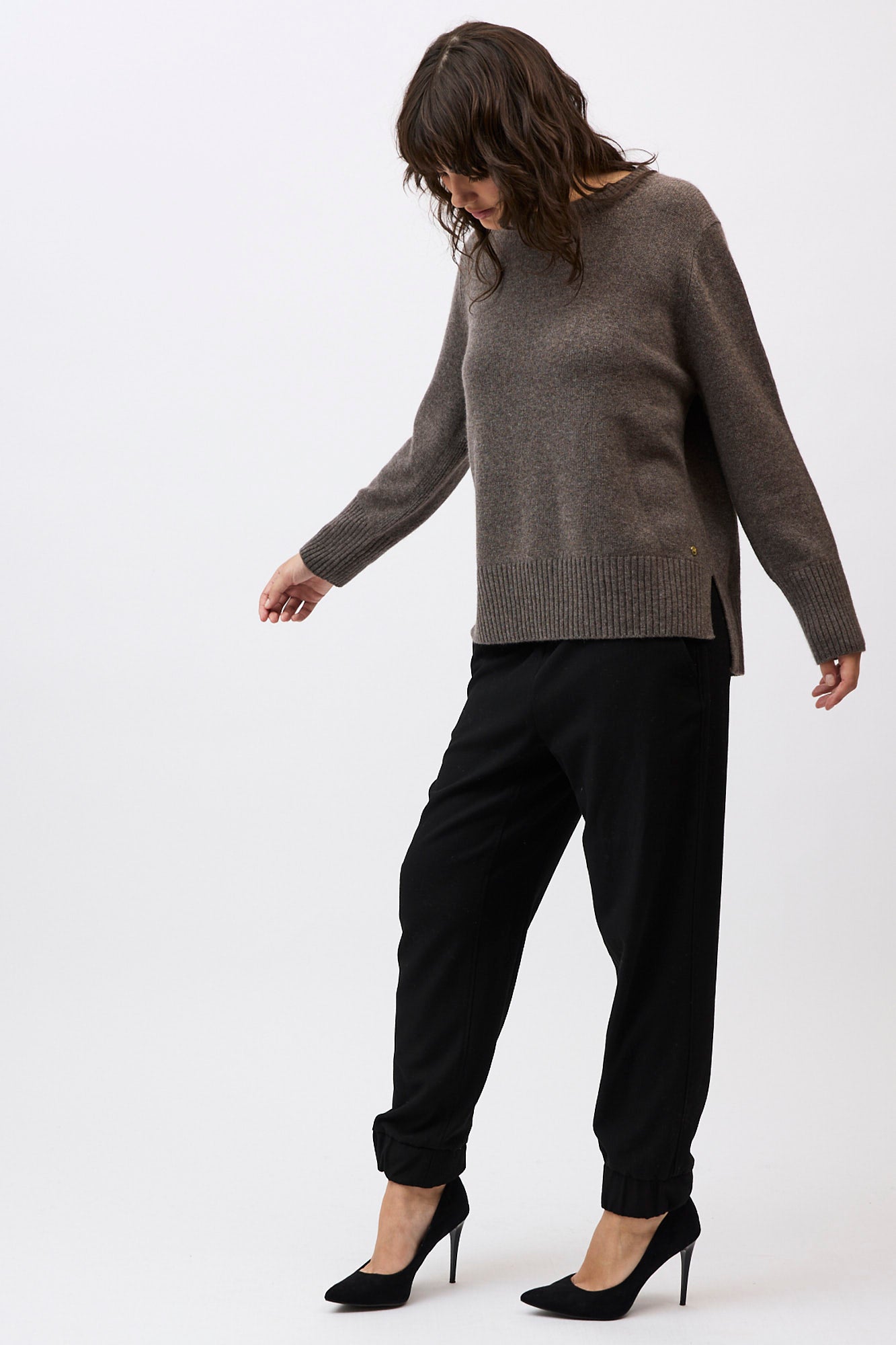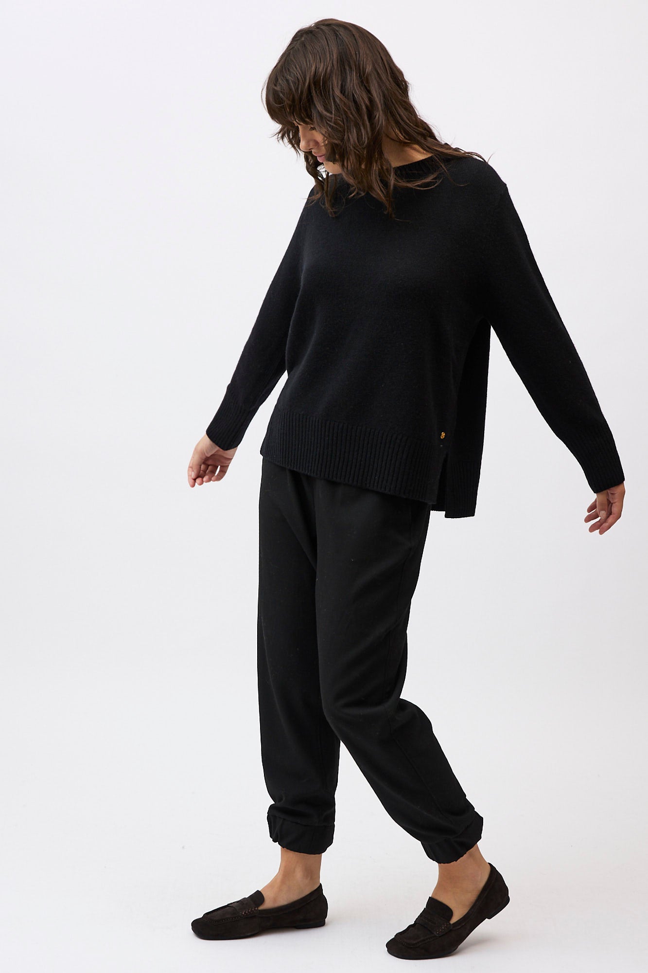 Silhouette: A classic crew neck profile featuring a contemporary high-low hem with deep side splits and exaggerated ribbed cuffs.