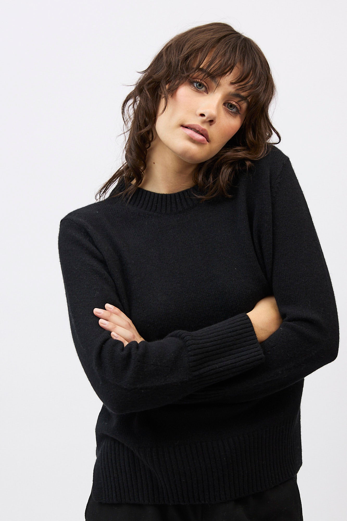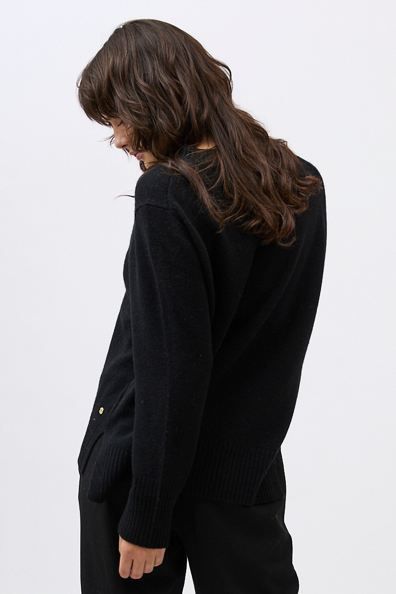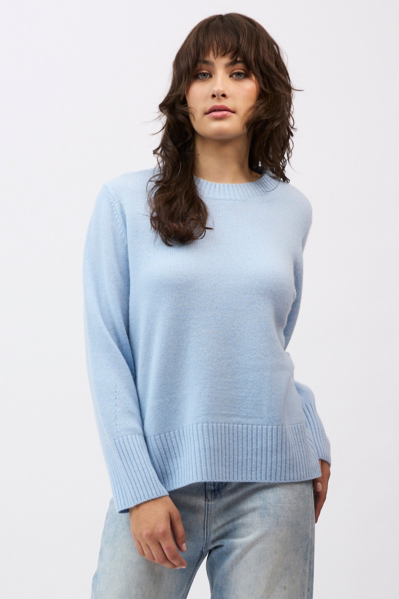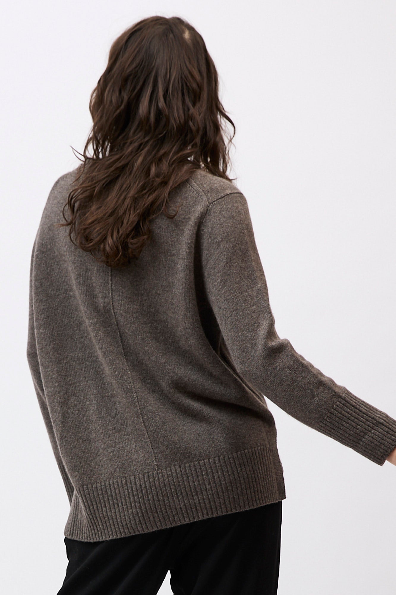Silhouette: A classic crew neck profile featuring a contemporary high-low hem with deep side splits and exaggerated ribbed cuffs.